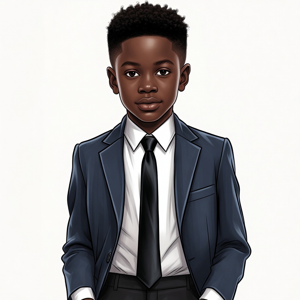 A young African boy with a curly afro hairstyle stands confidently wearing a navy blue suit, white dress shirt, and black tie. He faces forward with a neutral expression on a plain white background. The illustration features smooth shading and vibrant colors.