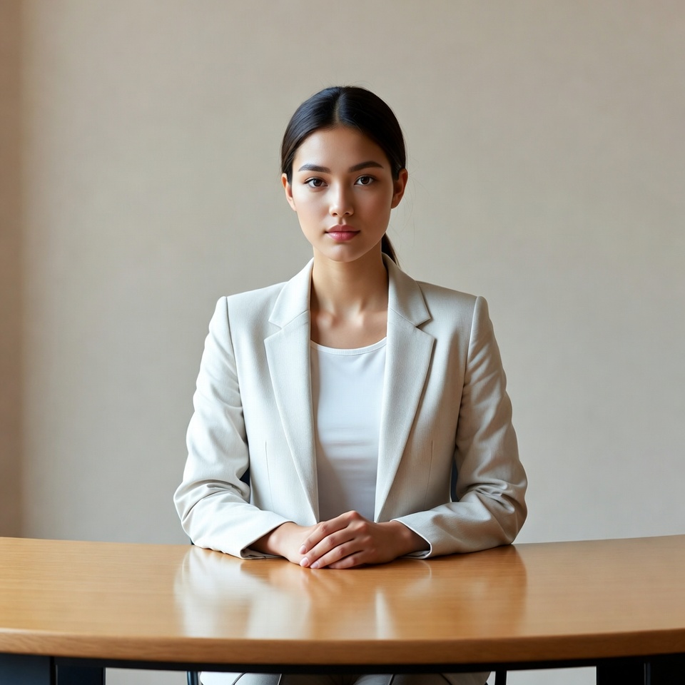 A young Asian woman with straight black hair in a ponytail sits at a wooden desk. She wears a white blazer over a white top and has her hands clasped in front of her. She faces the camera directly against a plain beige background.