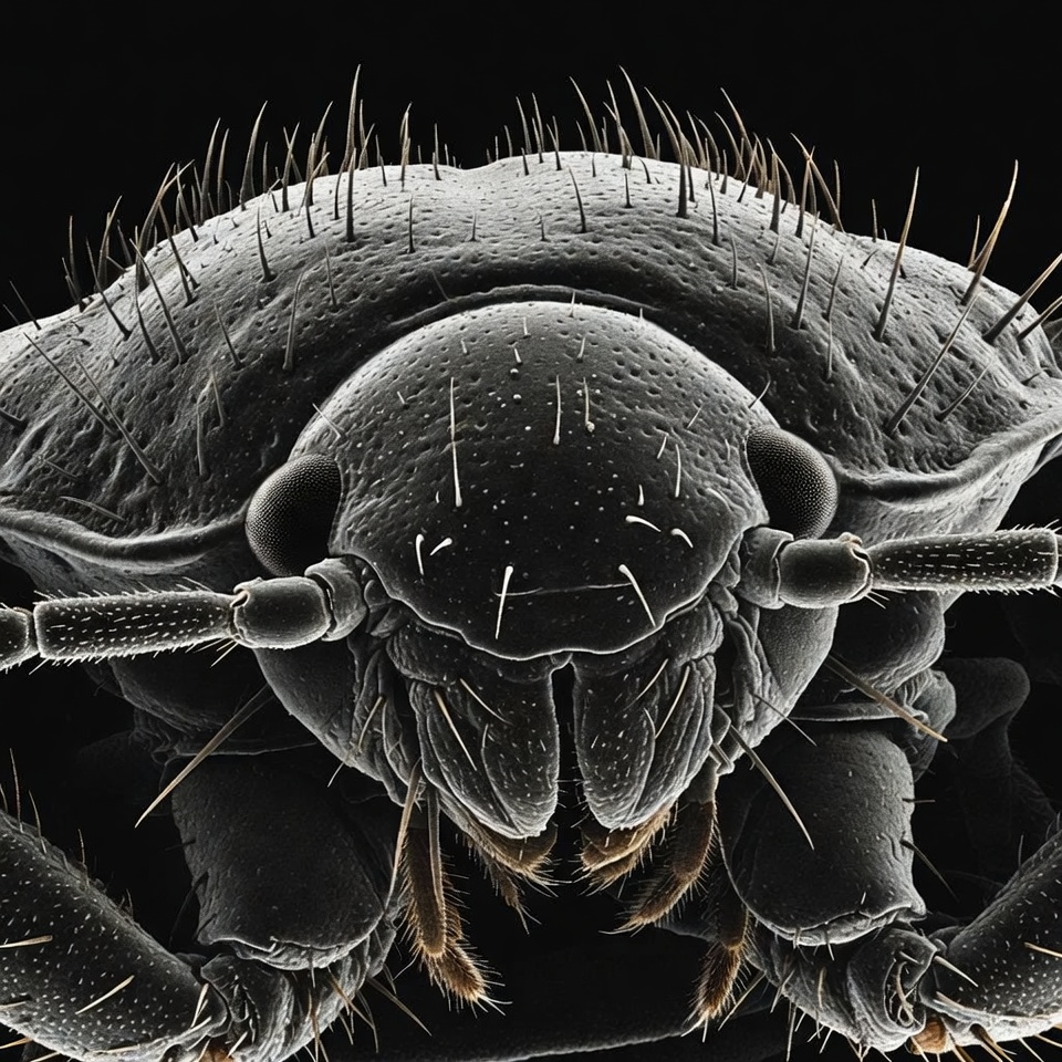 abdomen, antennae, arthropod, black background, bristles, bug, closeup, compound eyes, detailed, hairs, insect, isolated background, legs, macro, microscopy, pest, tail cerci, texture, thorax, silverfish