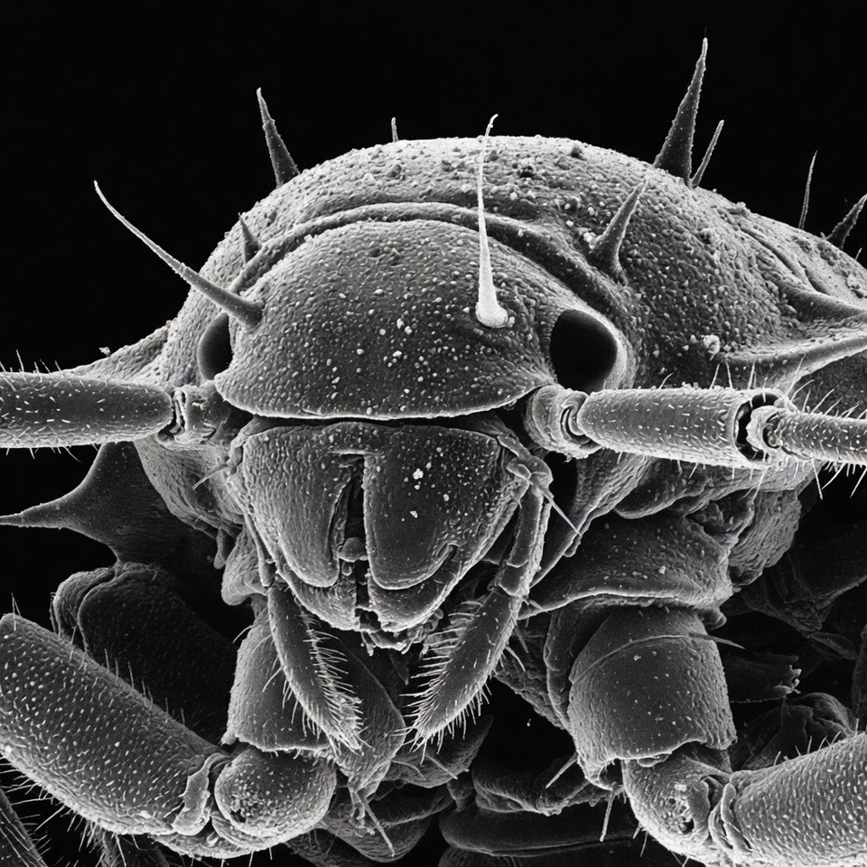 SEM, arthropod, black background, bristly mite, chelicerae, close-up, detailed, hairs, insect, legs, macro, microscopic, pedipalps, scanning electron microscope, scientific, spines, texture, tiny creature, zoology, mite