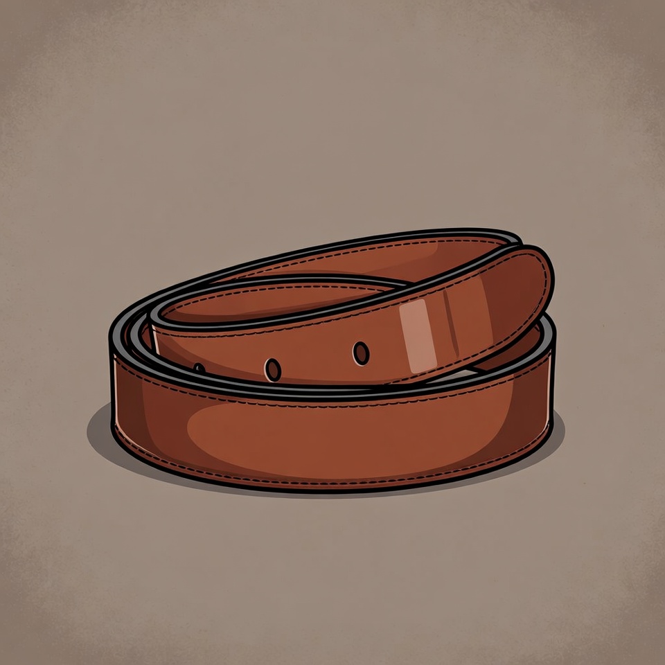 A coiled brown leather belt with a silver buckle is illustrated on a beige background. The belt features stitched edges and a glossy texture. It is depicted in a simple vector art style.