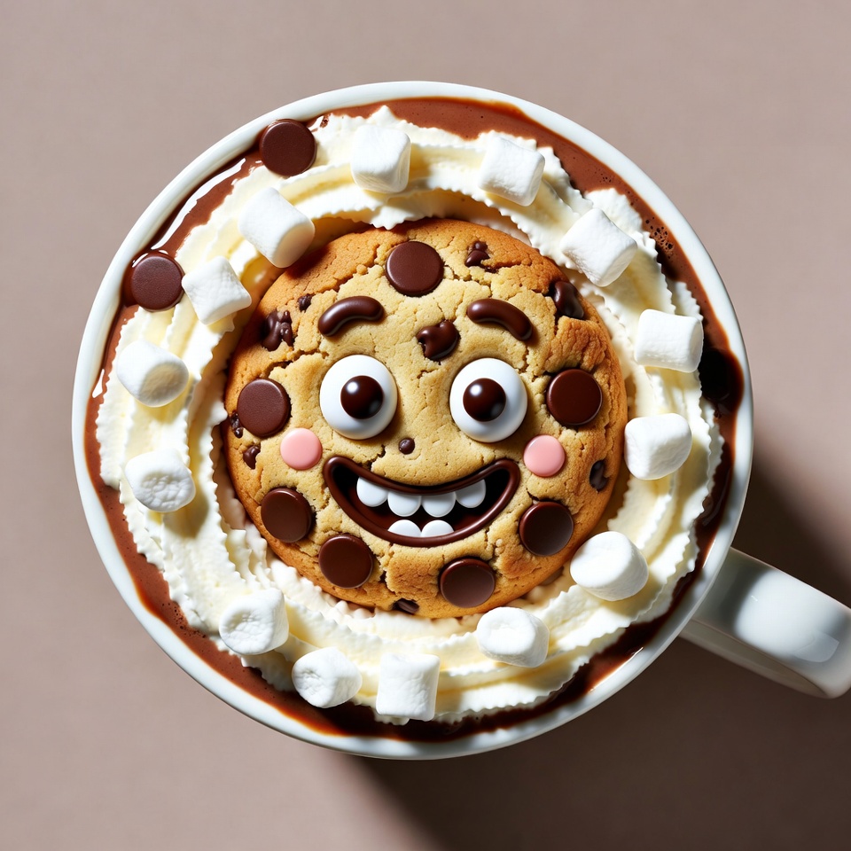 A white mug filled with hot chocolate features a large chocolate chip cookie with a smiling cartoon face on top. The cookie has big expressive eyes, rosy cheeks, and a wide grin, surrounded by swirls of whipped cream and chocolate drizzle. The entire scene is viewed from above against a plain beige background.