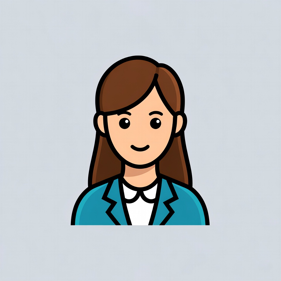 A cartoon illustration of a smiling woman with long brown hair and large eyes. She wears a blue blazer suit with a white collared shirt underneath. The flat icon is set against a light gray background.