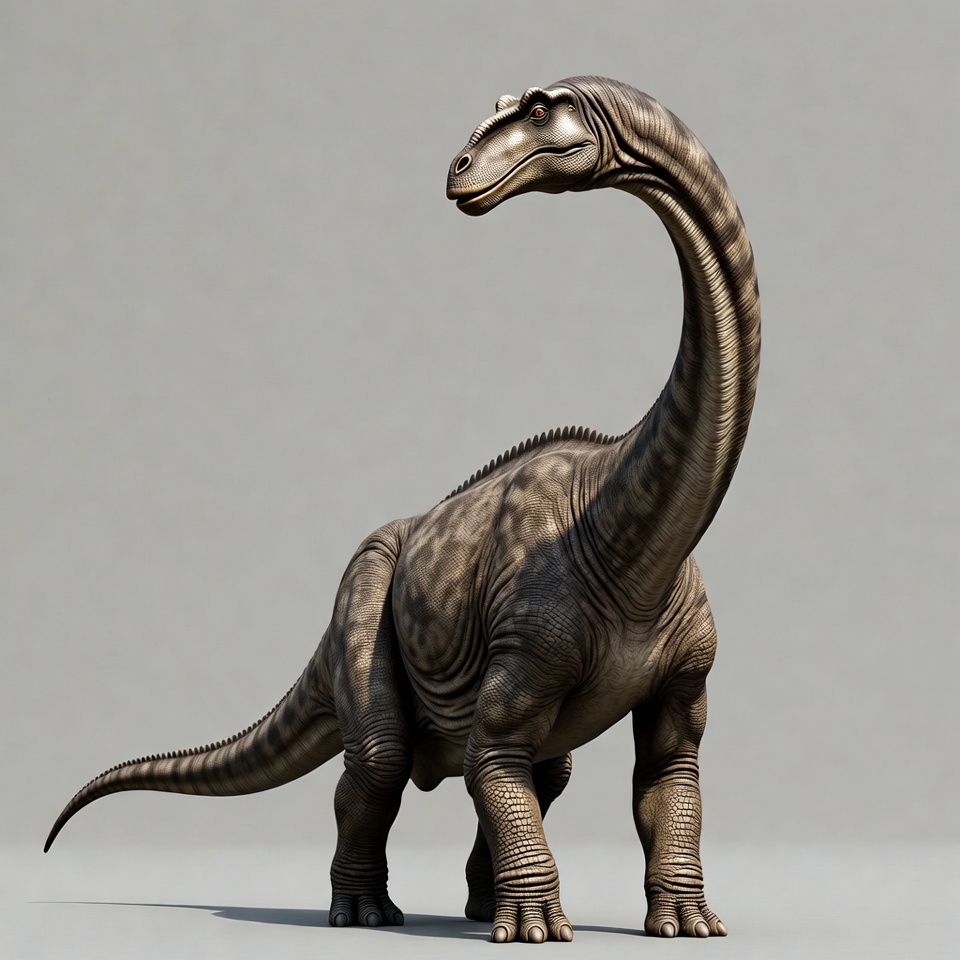 3D render, Jurassic, ancient reptile, brown dinosaur, digital model, dinosaur, extinct animal, gray background, herbivore, isolated, long neck, prehistoric, realistic render, sauropod, standing dinosaur, tall neck, textured skin, wildlife, Brontosaurus
