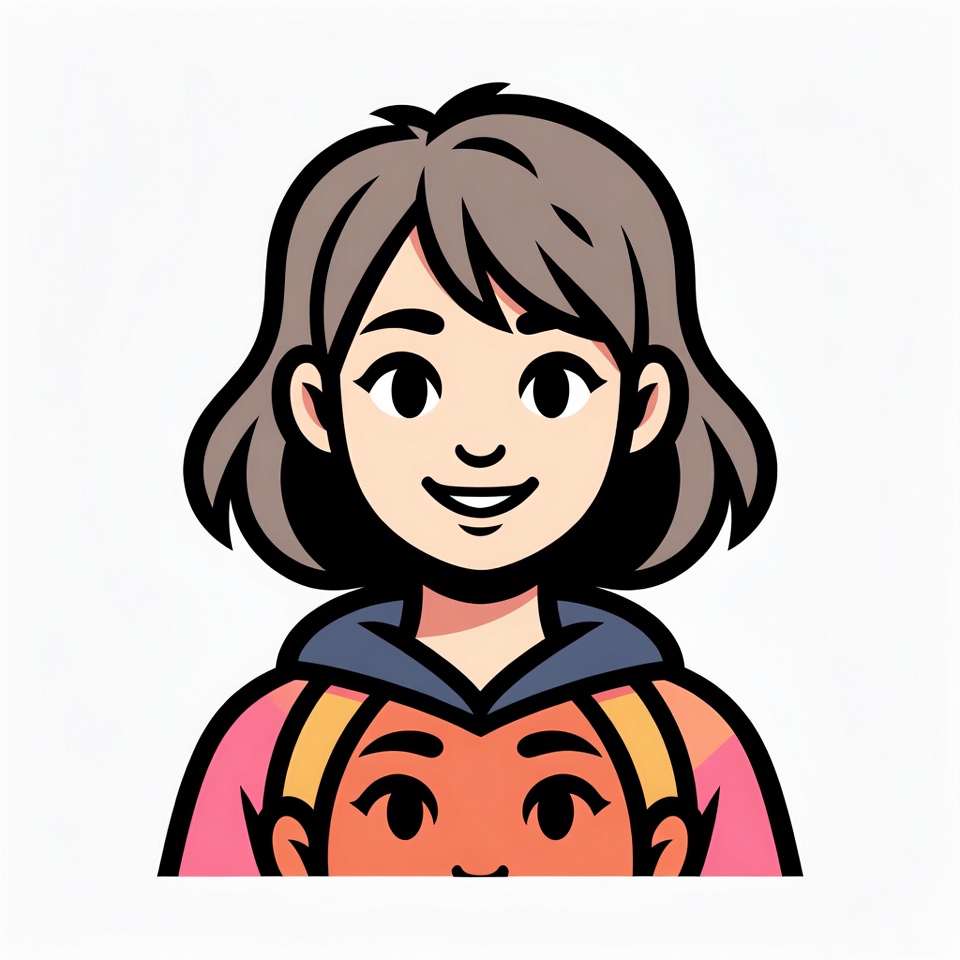 A cartoon illustration features a smiling girl with shoulder-length brown hair peeking out from a pink hoodie with a blue hood. She has large expressive eyes and a cheerful smile. An orange backpack strap is visible on her shoulder against a white background.