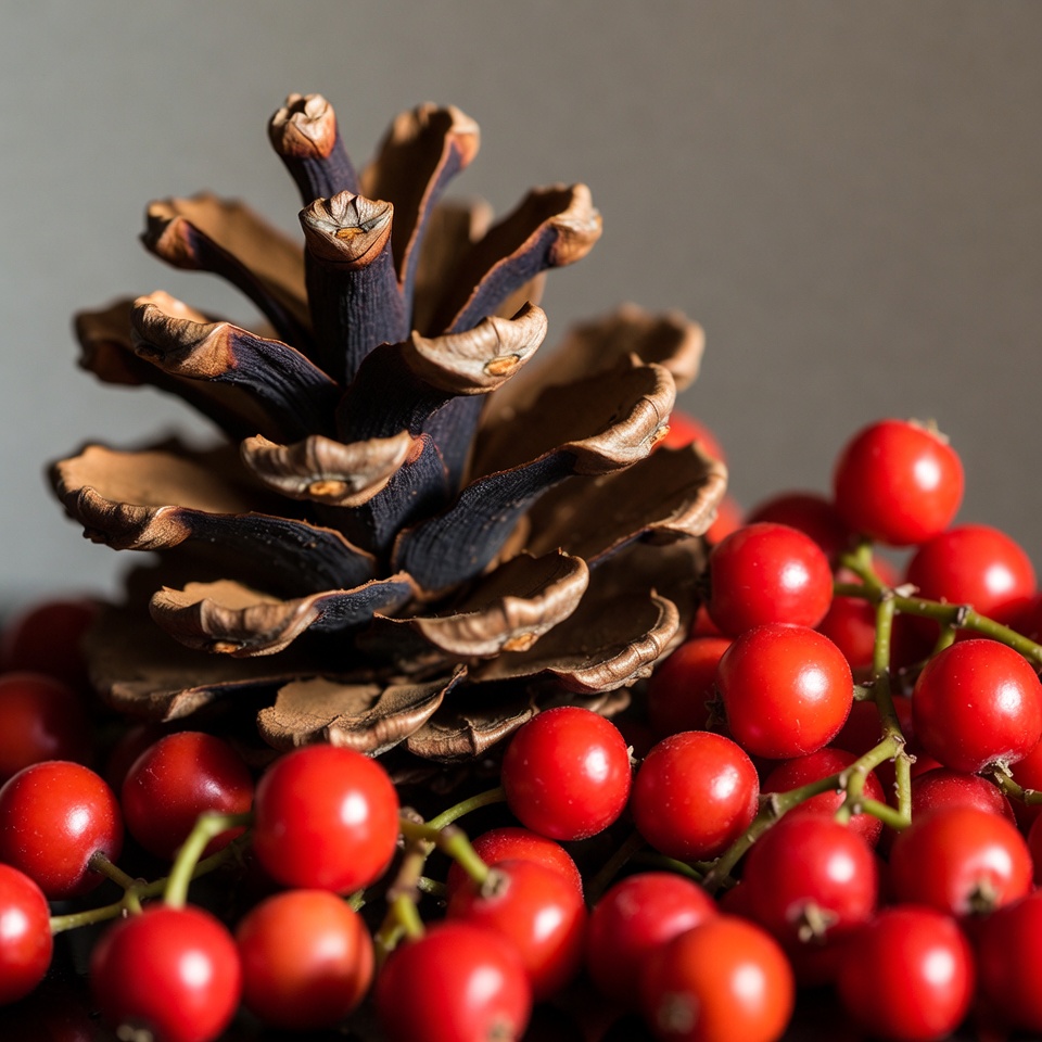 A large pine cone sits prominently on a bed of vibrant red berries with green stems. The cone features brown scales with darker tips, centered against a neutral gray background. The berries cluster densely around the base of the cone.
