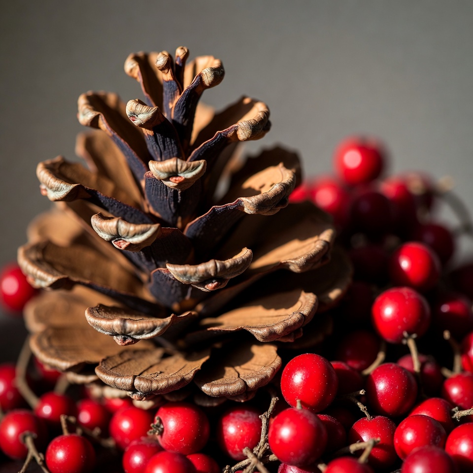 autumn, berries, botanical, brown pinecone, closeup, cluster, conifer, detailed, foliage, forest, gray background, holiday elements, macro photography, natural texture, nature, organic, plant elements, red berries, rustic, scales, seasonal, still life, vibrant red, winter decor, pine cone