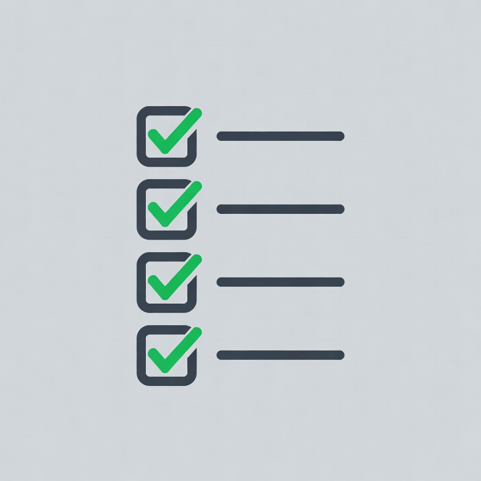 A vertical checklist icon features five square checkboxes, each with a green checkmark inside. Thin black lines extend from the right side of each checkbox. The entire illustration is rendered in a flat design style on a light gray background.