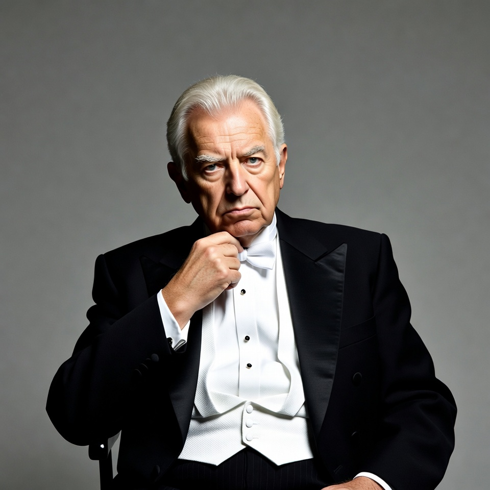White man, black tuxedo, bow tie, chin gesture, formal attire, formal wear, gray background, hand on chin, older gentleman, portrait, senior man, sitting, suit, thoughtful pose, tuxedo, vest, white bow tie, white hair, elderly man