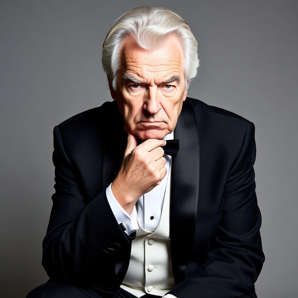 An elderly White man with white hair wears a black tuxedo, white vest, and bow tie. He sits against a gray background with a serious expression, touching his chin thoughtfully with his right hand. His suit features satin lapels and a crisp white shirt.