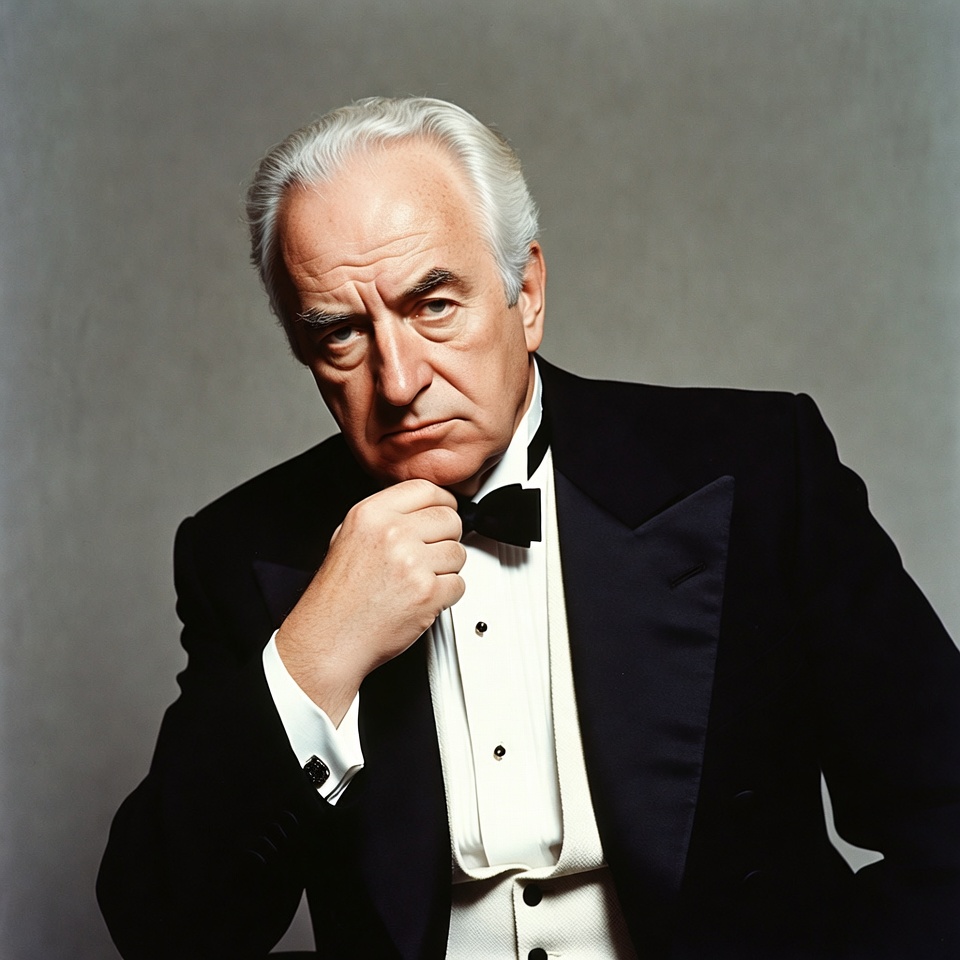 White, black suit, bowtie, formal wear, gray background, hand gesture, male, older man, portrait, serious expression, sitting, tuxedo, white hair, white shirt, elderly man