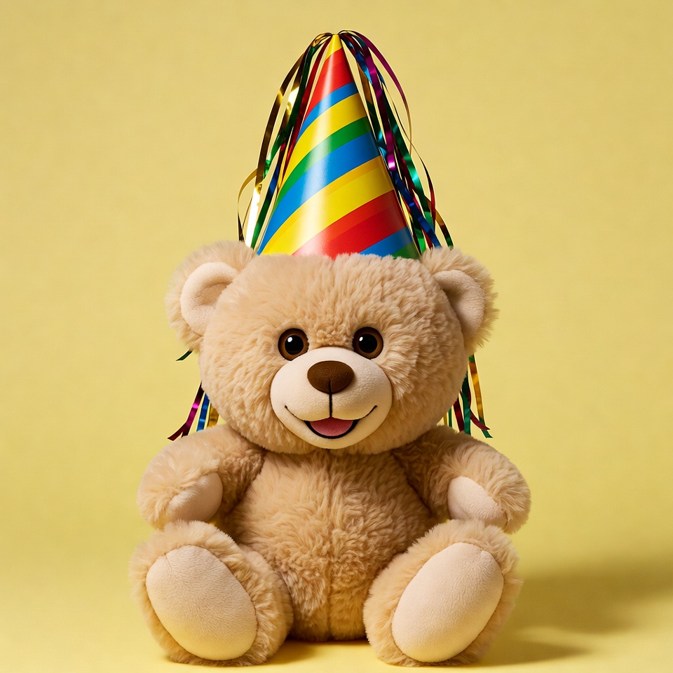 adorable, bear, birthday hat, brown bear, cartoon bear, celebration, conical hat, cute bear, festive, illustration, isolated background, party, party hat, plush toy, rainbow hat, smiling bear, streamers, toy bear, yellow background, teddy bear