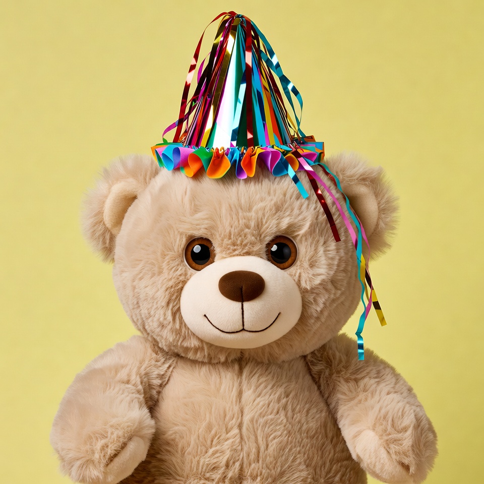A cute plush teddy bear with brown fur wears a colorful party hat with multicolored streamers. The bear has big expressive eyes and a smiling mouth, posed against a solid yellow background. The hat features shiny foil ribbons in various bright colors.
