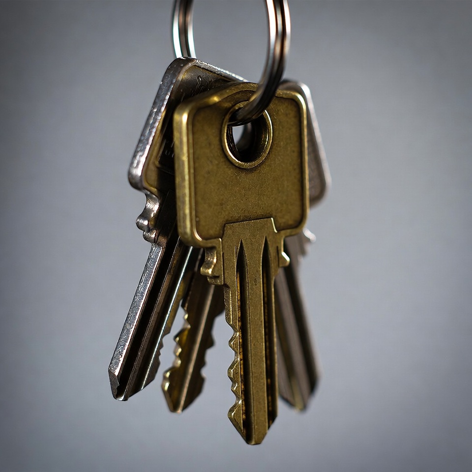 Several metal keys in silver and gold tones hang from a keyring against a blurred gray background. The keys feature notched edges and vary in size and shape. They are clustered together, dangling downward.