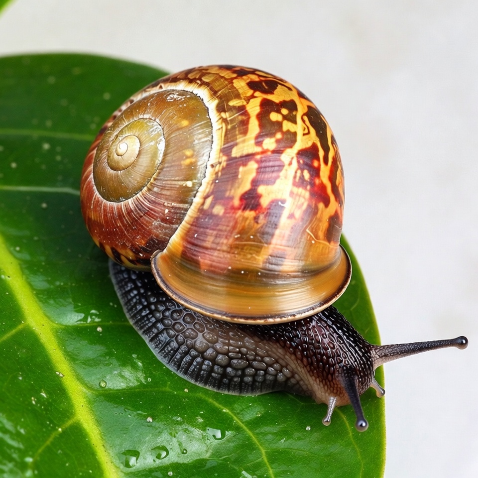 A large snail with a brown and orange spiral shell crawls on a wet green leaf. The shell features intricate dark brown patterns and a glossy surface. The snail's dark body and extended tentacles are visible against the fresh leaf.