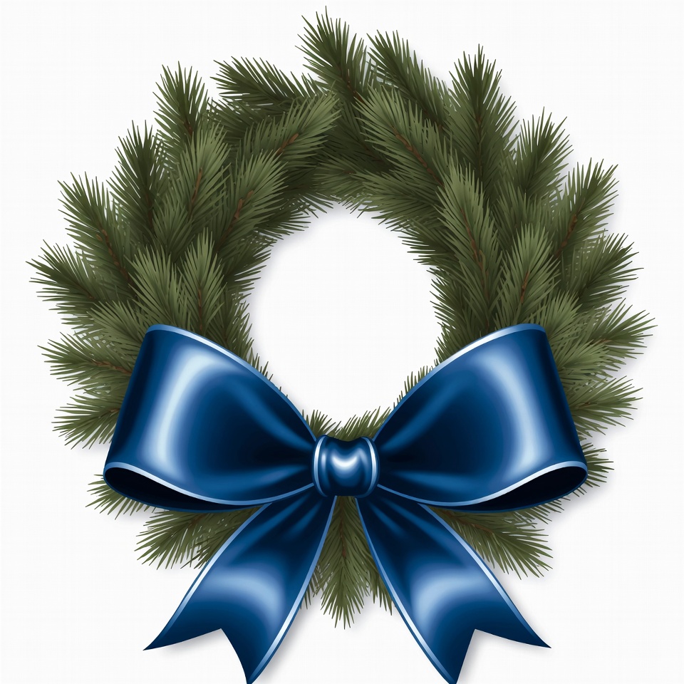Christmas decor, blue bow, clipart, evergreen wreath, festive wreath, fir needles, green wreath, holiday decoration, illustration, isolated background, pine branches, satin ribbon, vector graphic, winter wreath, wreath, Christmas wreath