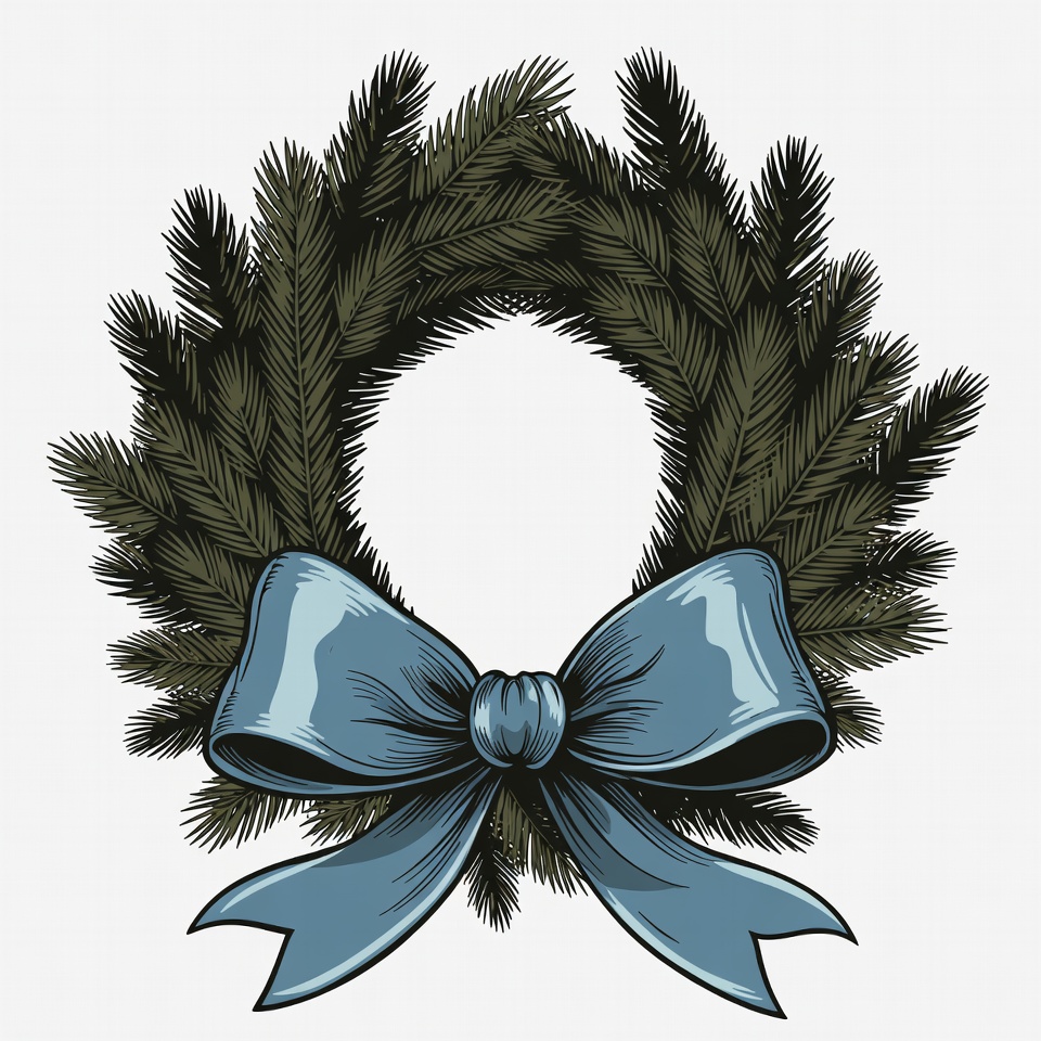 A circular evergreen wreath made of fir branches features a large blue satin bow at the bottom. The wreath has a transparent center and is rendered in a hand-drawn illustration style. The branches are dark green with detailed needles, and the bow has shiny folds.