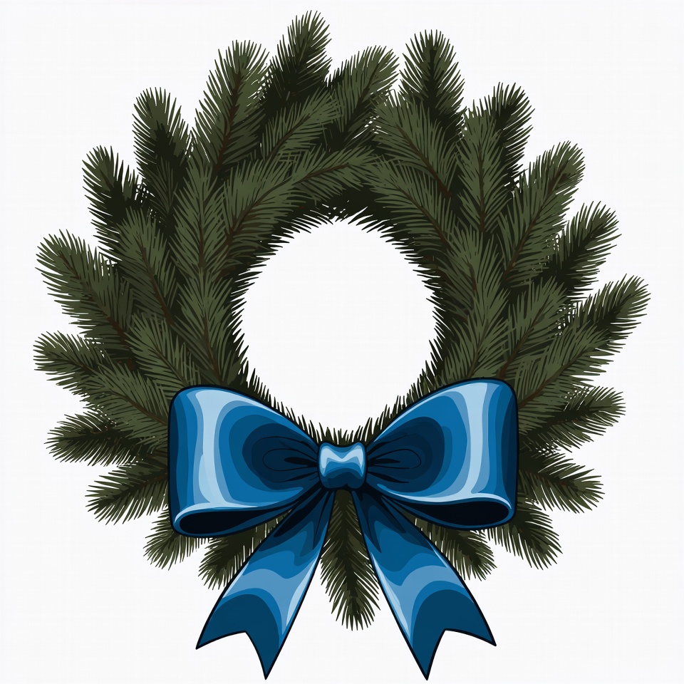 Christmas decor, blue bow, blue ribbon, clipart, evergreen wreath, festive wreath, fir needles, green wreath, holiday clipart, holiday decoration, illustration, isolated background, pine branches, satin ribbon, vector wreath, wreath bow, Christmas wreath