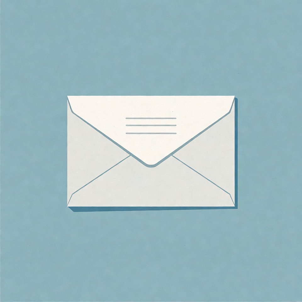 A simple white envelope with a flap and address lines is centered on a solid light blue background. The envelope is depicted in a flat illustration style with subtle shading for depth. It appears sealed and ready for mailing.