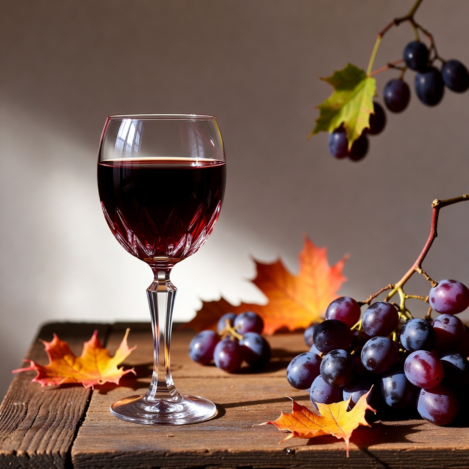 A crystal wine glass filled with deep red wine stands on a wooden table. Clusters of dark purple grapes and vibrant orange autumn leaves surround the glass. Soft lighting casts gentle shadows, enhancing the rich textures.