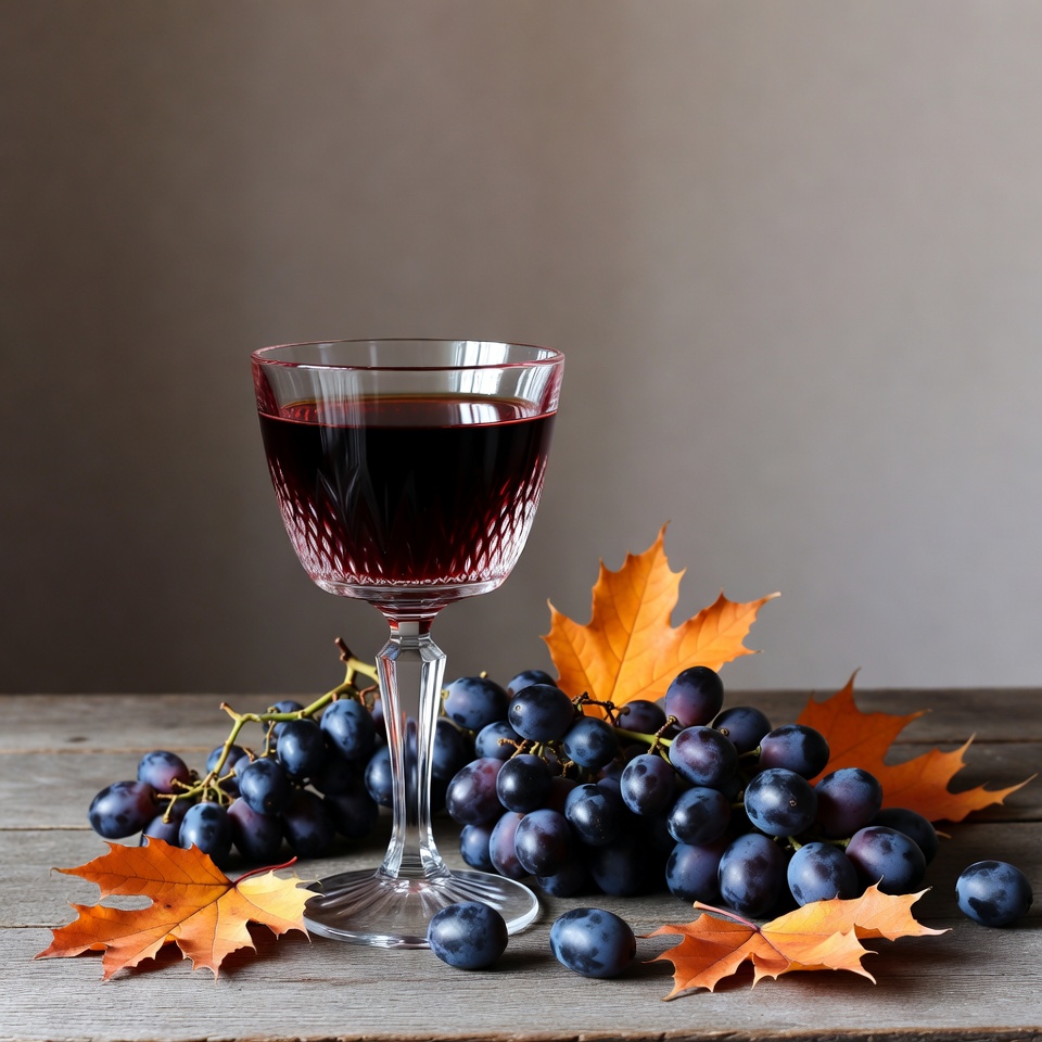 alcohol, autumn leaves, beverage, clusters, composition, dark grapes, elegant, faceted glass, fall decor, grapes, harvest, leaf arrangement, orange leaves, purple grapes, still life, vineyard, wine glass, wine tasting, wooden table, red wine