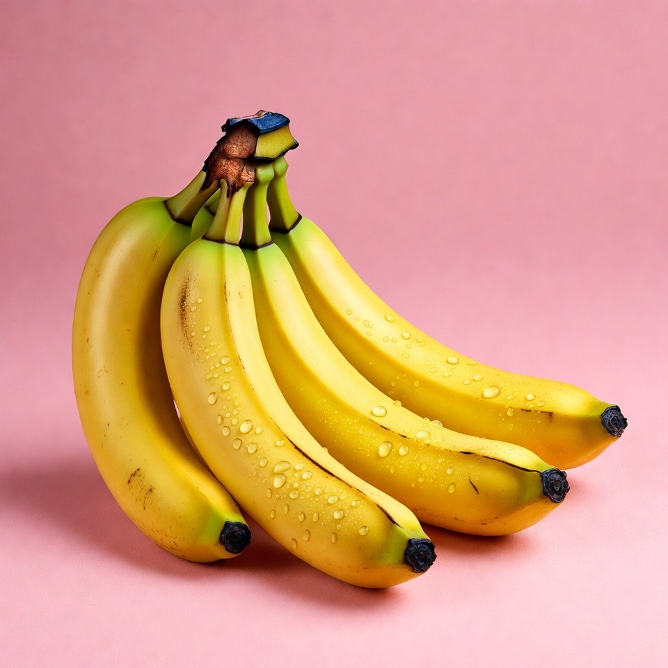 A bunch of ripe yellow bananas with water droplets stands on a solid pink background. The bananas are clustered together with green stems and dark tips. They appear fresh and glossy from the moisture.