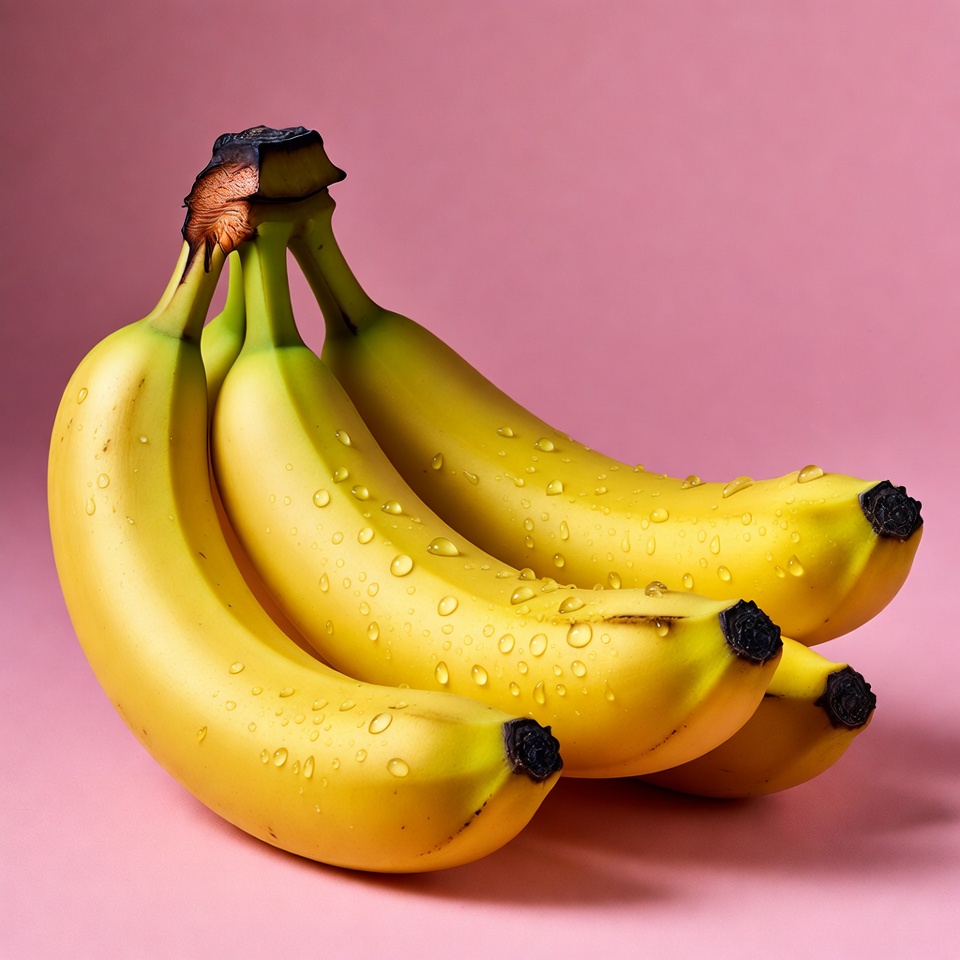 A cluster of four ripe yellow bananas stands together on a pink background. Water droplets glisten on their smooth peels, highlighting their freshness. The bananas are slightly curved with dark tips.