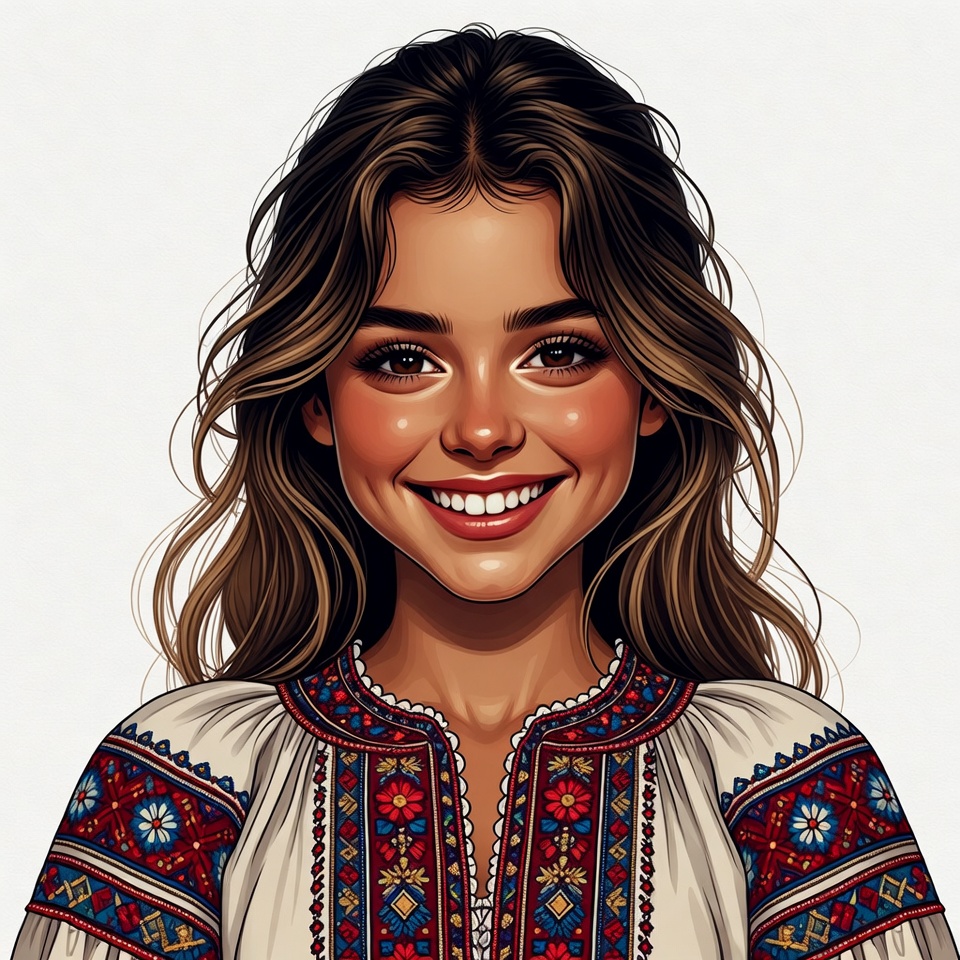 A young girl with wavy brown hair smiles warmly at the viewer. She wears a traditional white blouse with intricate red, blue, and floral embroidery around the neckline. The portrait is rendered in a detailed digital illustration style on an isolated white background.