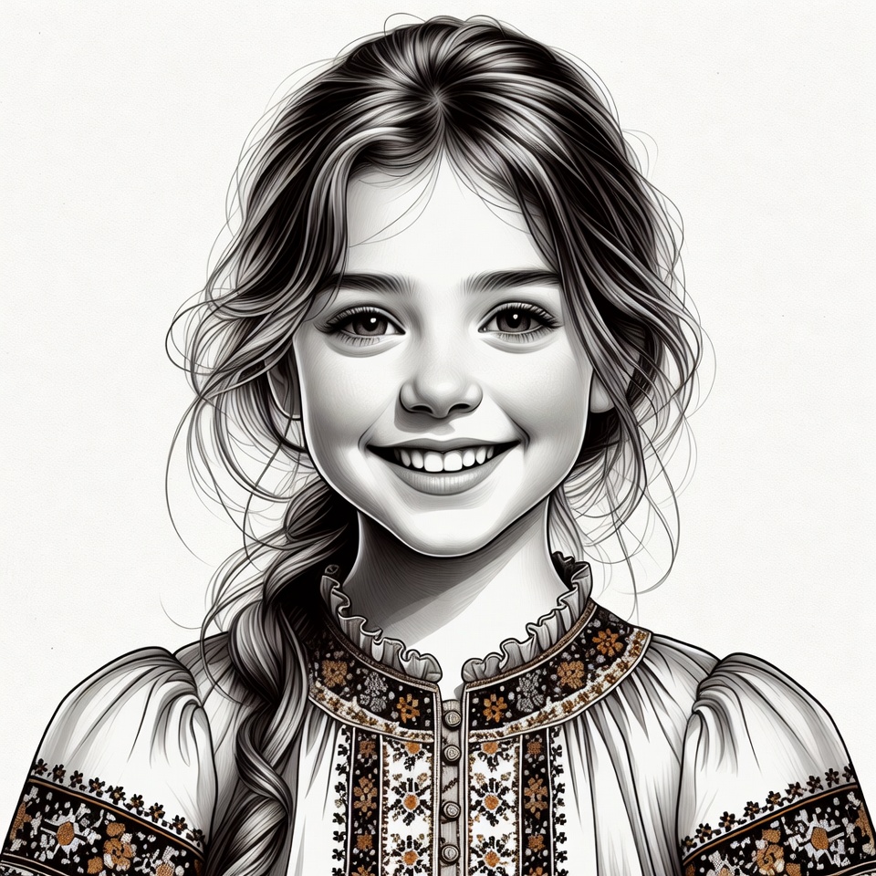 A young girl with long wavy brown hair smiles happily at the viewer. She wears a white traditional dress with intricate orange and black embroidery on the collar and bodice. The portrait is rendered in detailed pencil illustration style on a white background.