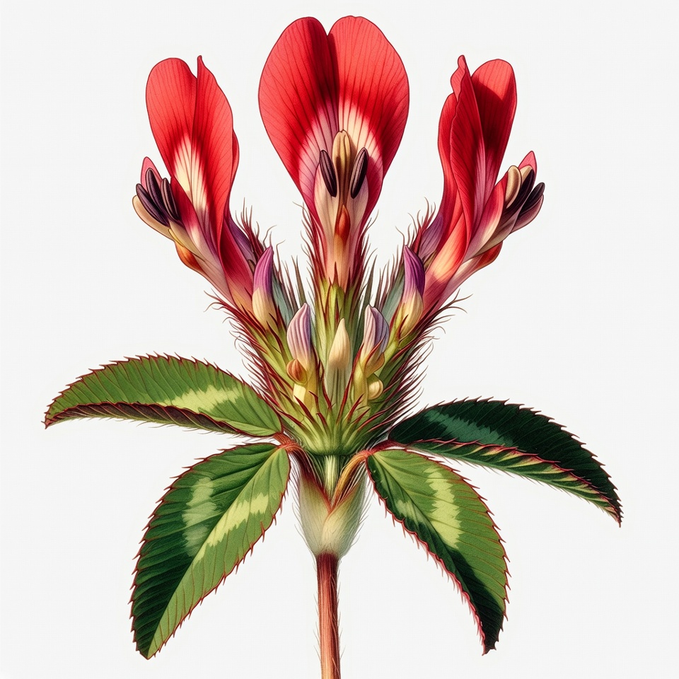 Trifolium, botanical illustration, clover flower, detailed drawing, flower closeup, flowering plant, green leaves, isolated background, nature art, plant illustration, red petals, serrated leaves, stem, vintage style, white edges, wildflower, red clover