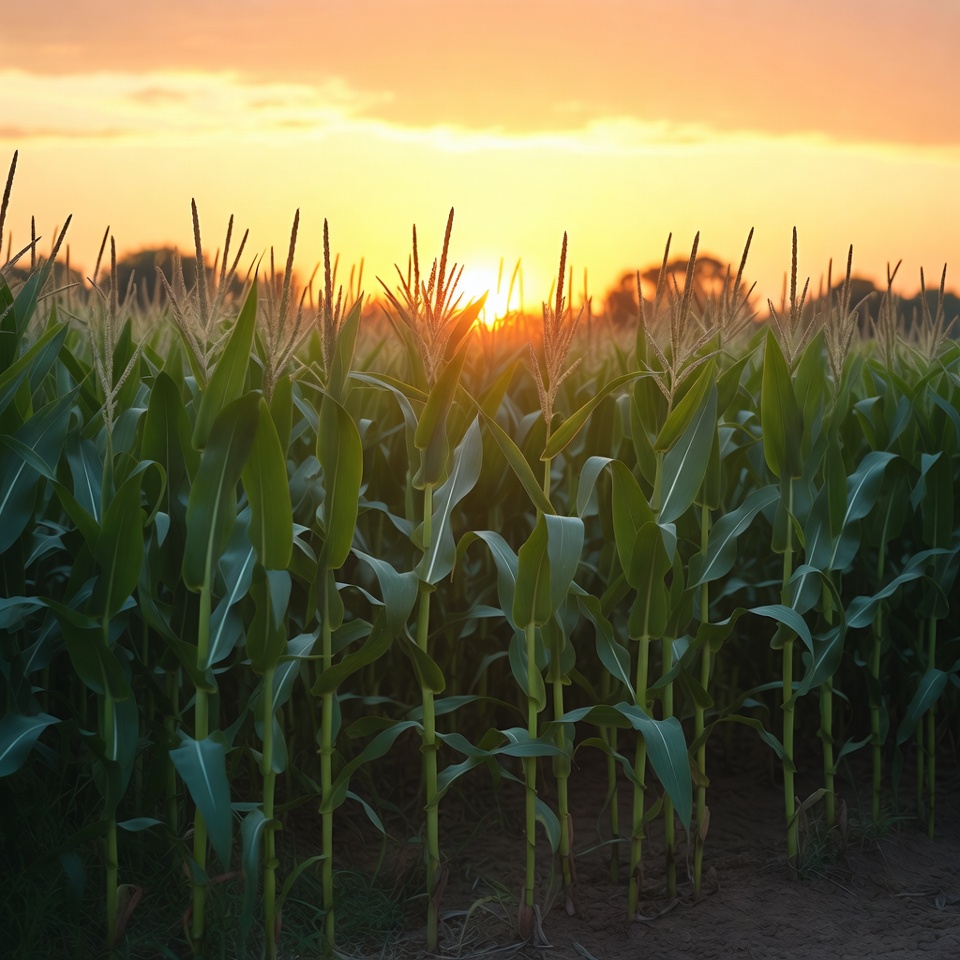 agriculture, clouds, corn stalks, crops, evening sky, farming, field, golden hour, green leaves, harvest time, maize, nature, orange sky, outdoors, rural landscape, sun rays, sunset, tassels, warm light, corn field