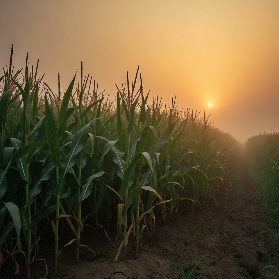 A narrow dirt path winds through tall green corn stalks in a misty field during sunset. The sun glows orange on the horizon, casting a warm light over the crops shrouded in fog. Corn tassels sway gently above the rows.
