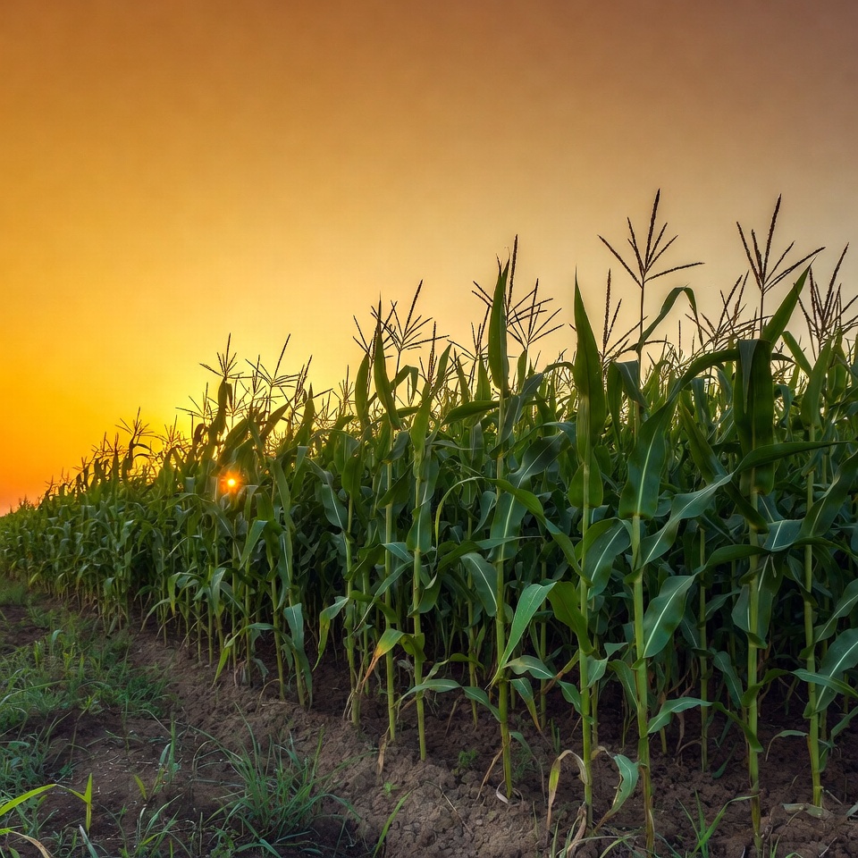 A lush corn field with tall green stalks lines a dirt path during sunset. The sky glows in vibrant orange and yellow hues as the sun dips behind the crops. Silhouetted corn plants sway gently in the golden light.