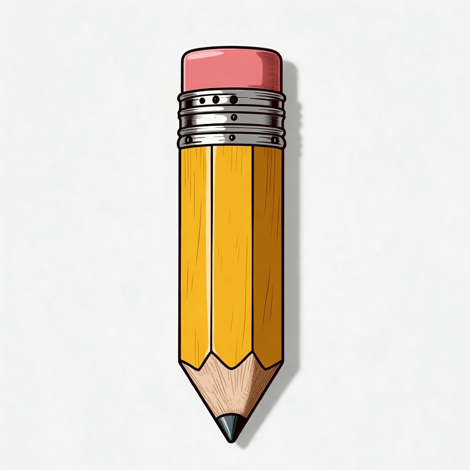 A cartoon yellow pencil stands vertically on an isolated white background. It features a pink eraser on top, silver ferrule bands, and a sharp black tip at the bottom.