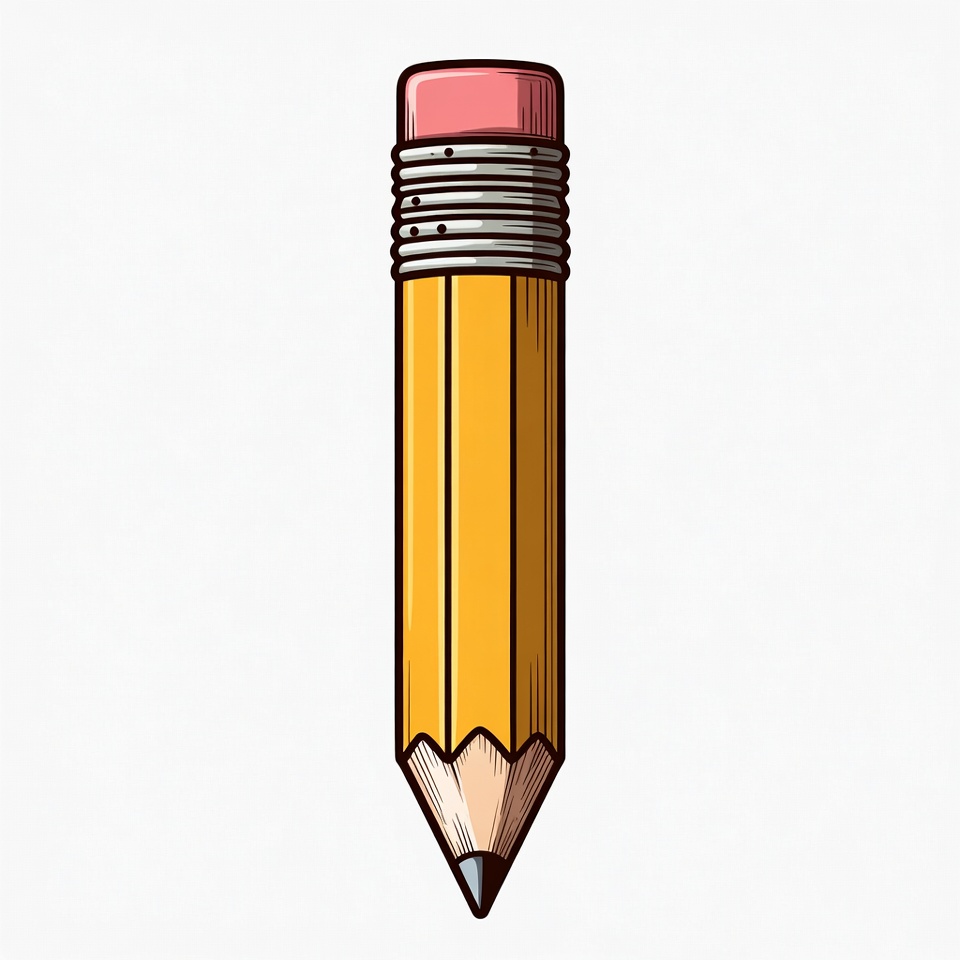 A cartoon-style yellow pencil stands vertically on a white background. It features a pink eraser on top, silver ferrule with bands, and a sharp black graphite tip. The wooden body has detailed hexagonal outlines.