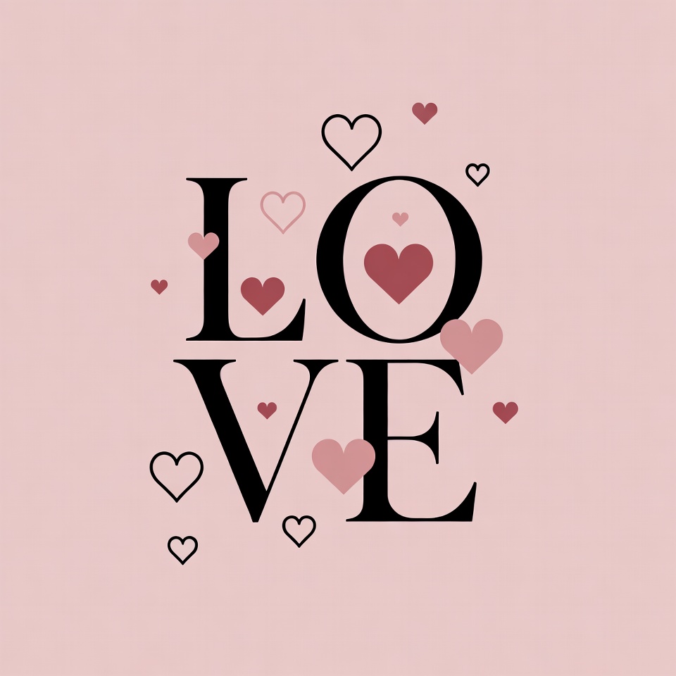 Bold black 'LOVE' text is styled with pink and red hearts integrated into the letters on a soft pink background. Various heart shapes in pink, red, and black outlines float around the word. The design features a clean, illustrative clipart style.