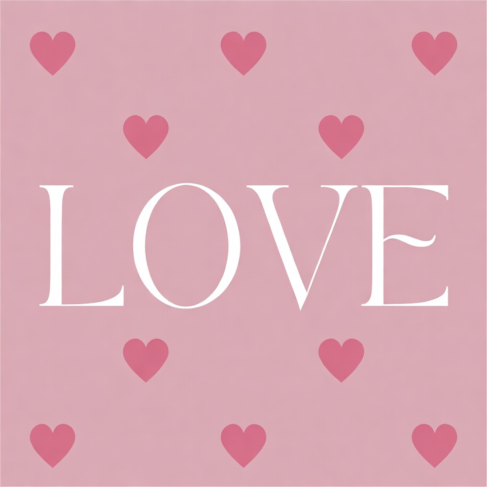 A square graphic features the word 'LOVE' in large white elegant font centered on a pastel pink background. Multiple small pink heart icons are scattered around the text. The design is simple and isolated on a solid background.