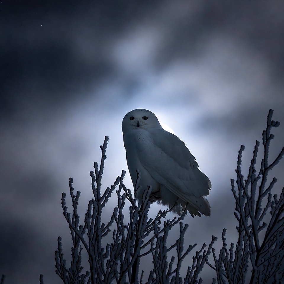 arctic owl, bare branches, bird, clouds, dark background, feathers, moonlit, night sky, nocturnal, owl, perch, snow, stars, white owl, wildlife, winter, yellow eyes, snowy owl