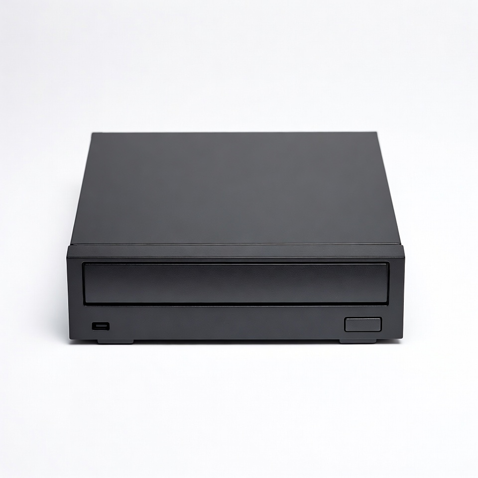 CD drive, PC accessory, USB drive, black drive, computer hardware, data storage, eject button, external drive, isolated background, laptop drive, optical drive, slimline drive, tray loader, white background, DVD drive