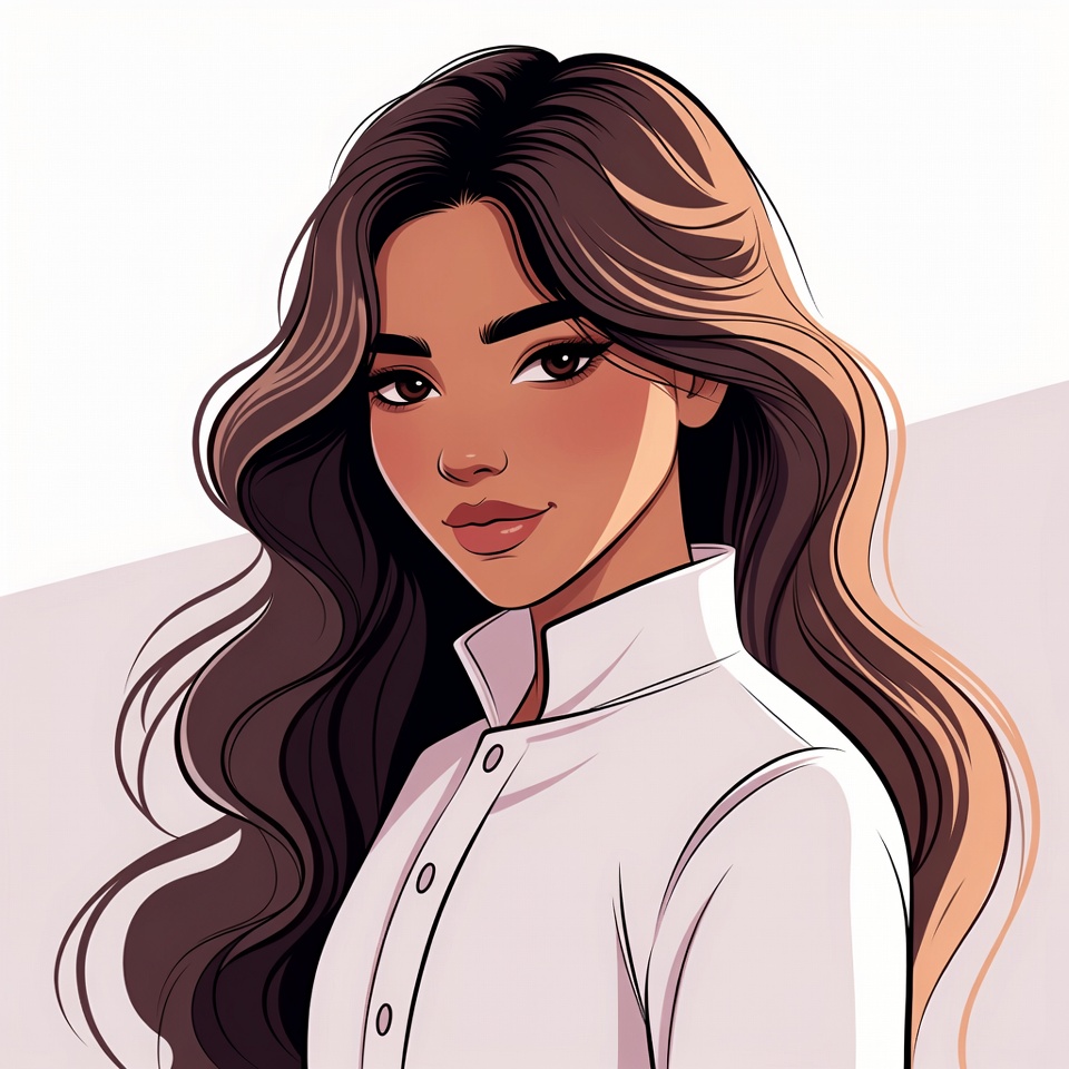 A young woman with long wavy brown hair and glowing skin faces forward in a stylized illustration. She wears a white collared shirt with buttons and has a subtle smile. The image features a plain light background.