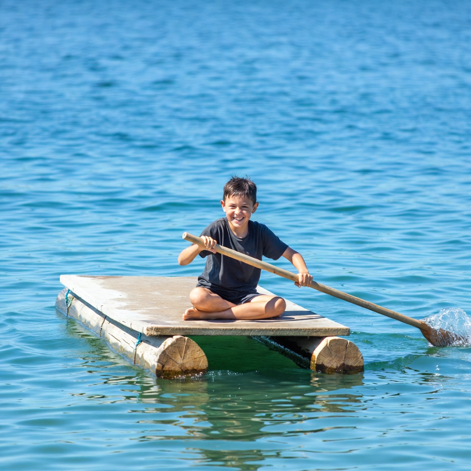 White, adventure, blue water, calm water, cross-legged, gray t-shirt, lake, logs, male, oar, outdoor, paddle, paddling, raft, shorts, sitting, smiling, summer, wooden raft, young boy, boy
