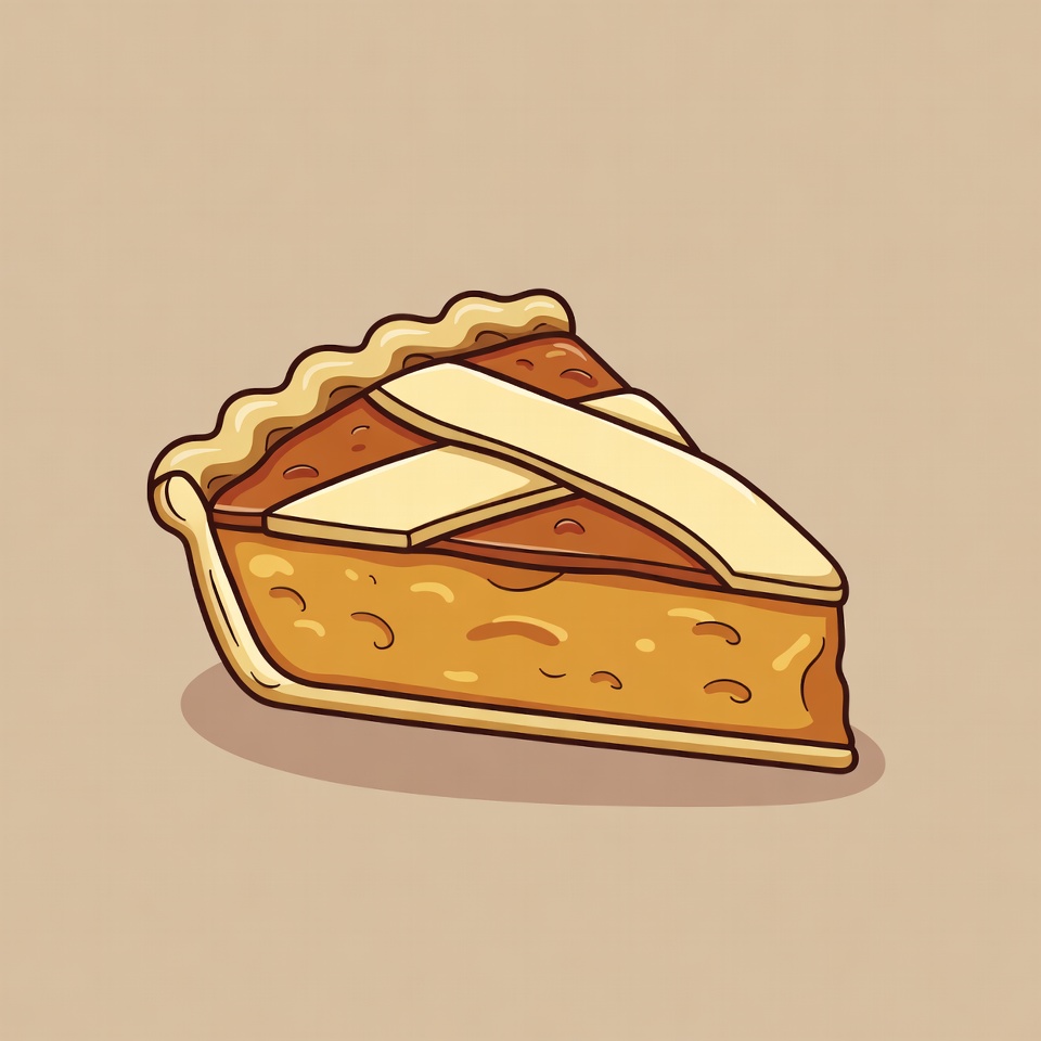 A colorful illustration of a single slice of pumpkin pie with a lattice crust topping. The pie features a golden-brown crust and rich orange filling, placed on a beige background. The style is cartoonish with smooth outlines and vibrant shading.