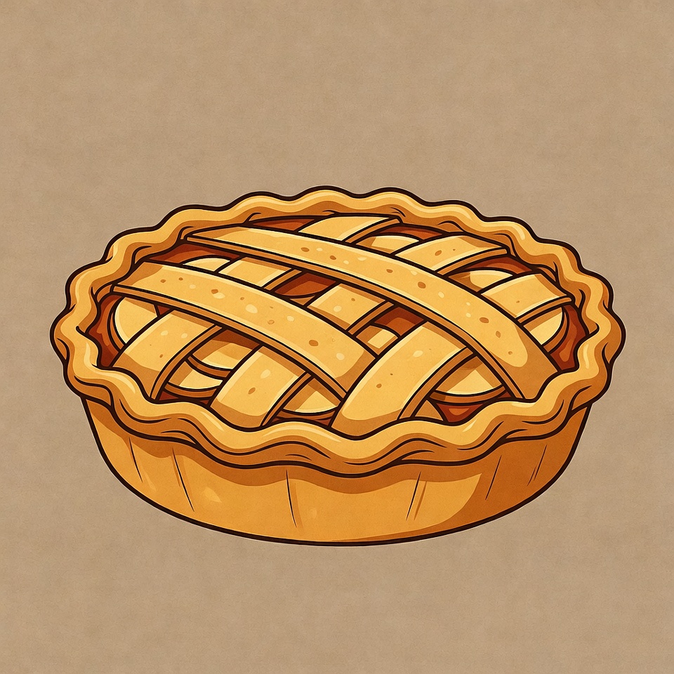 A colorful cartoon illustration of a whole apple pie with golden lattice crust on top. The pie sits on a plain beige background, isolated for easy viewing. Shiny filling peeks through the crisscross pastry.