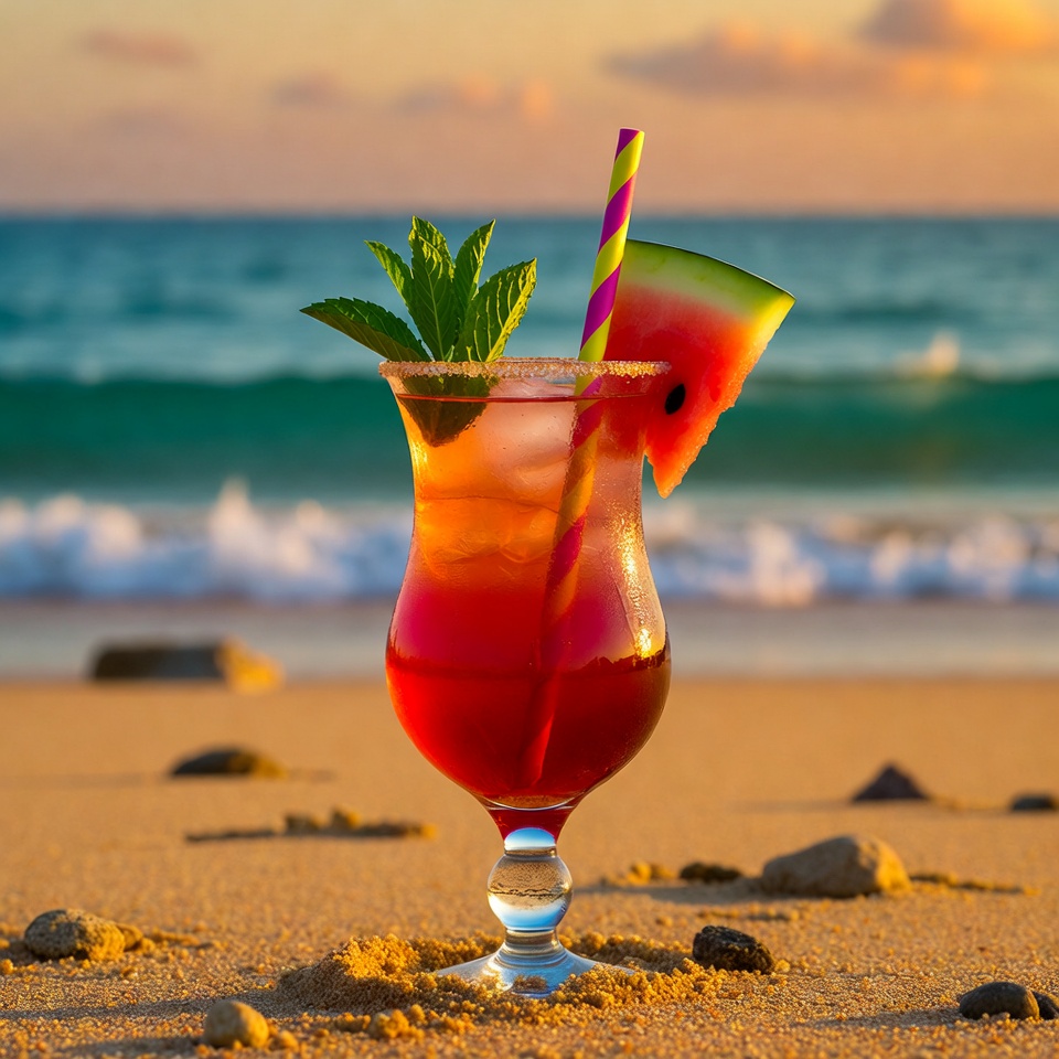 A tall hurricane glass filled with red watermelon cocktail sits on sandy beach with ocean waves in the background. It is garnished with a striped straw, fresh mint leaves, watermelon wedge, and salt rim. The scene is set at sunset with vibrant orange skies and turquoise water.