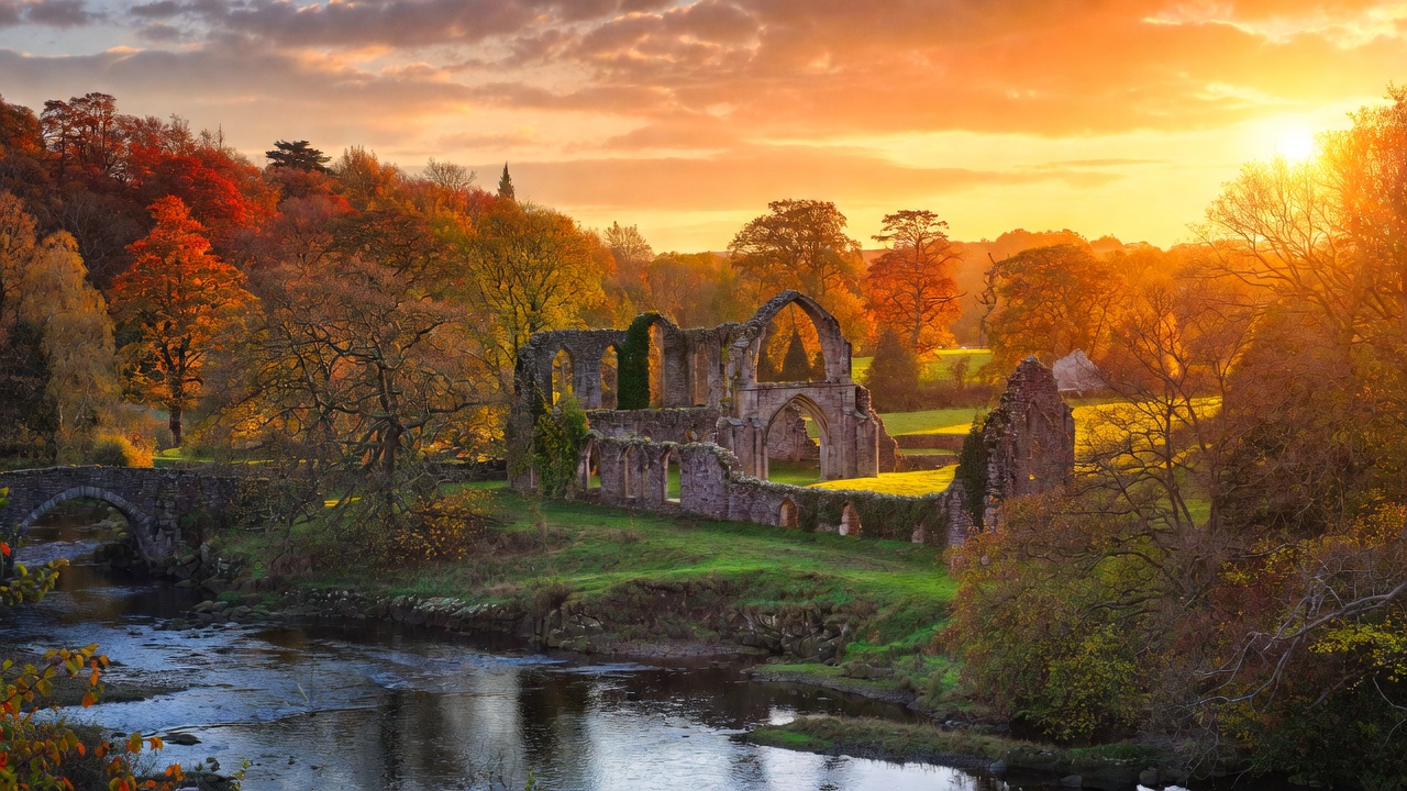 Europe, ancient ruins, autumn trees, cloudy sky, countryside, dusk, fall foliage, foliage, golden hour, green grass, heritage, historic site, landscape, nature, orange sky, red leaves, river, scenery, stone arch, stone bridge, sunset, travel, vibrant colors, water reflection, woodland, abbey ruins