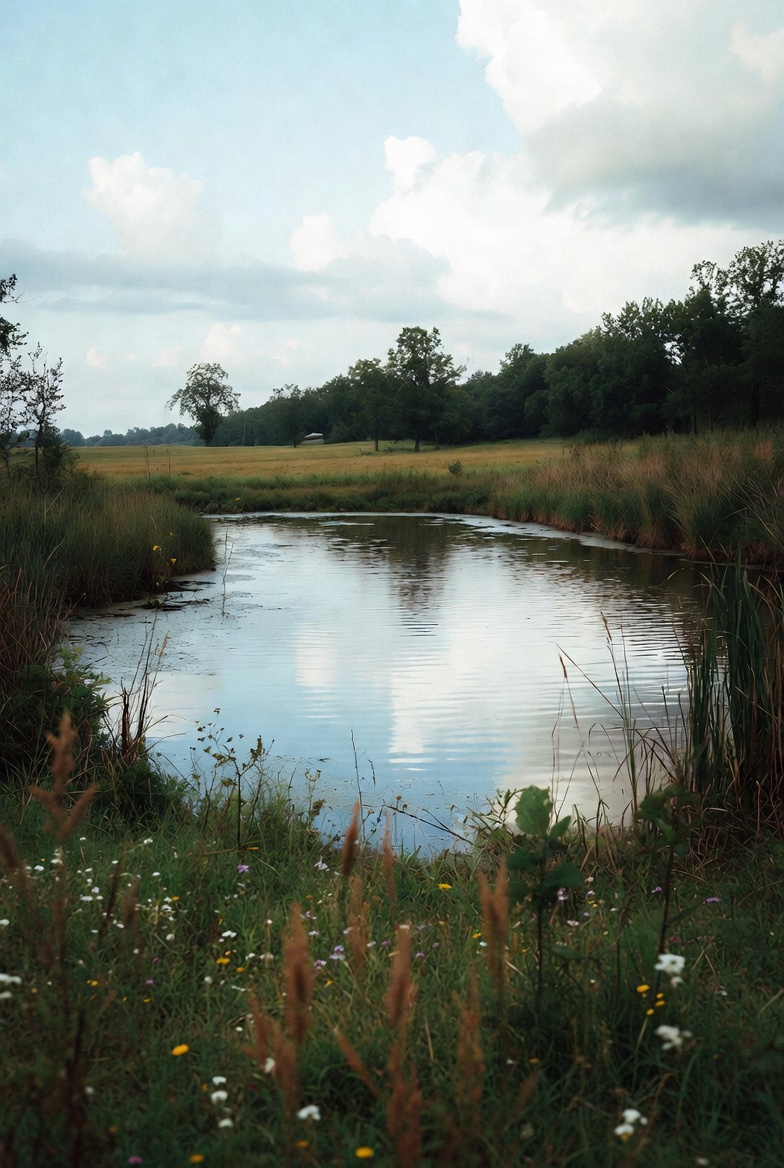 clouds, cloudy sky, countryside, environment, field, foliage, grass, green field, landscape, meadow, natural, nature, outdoors, peaceful, reeds, reflection, rural, scenery, serene, sky, stream, trees, vegetation, water, waterway, wetland, wildflowers, river