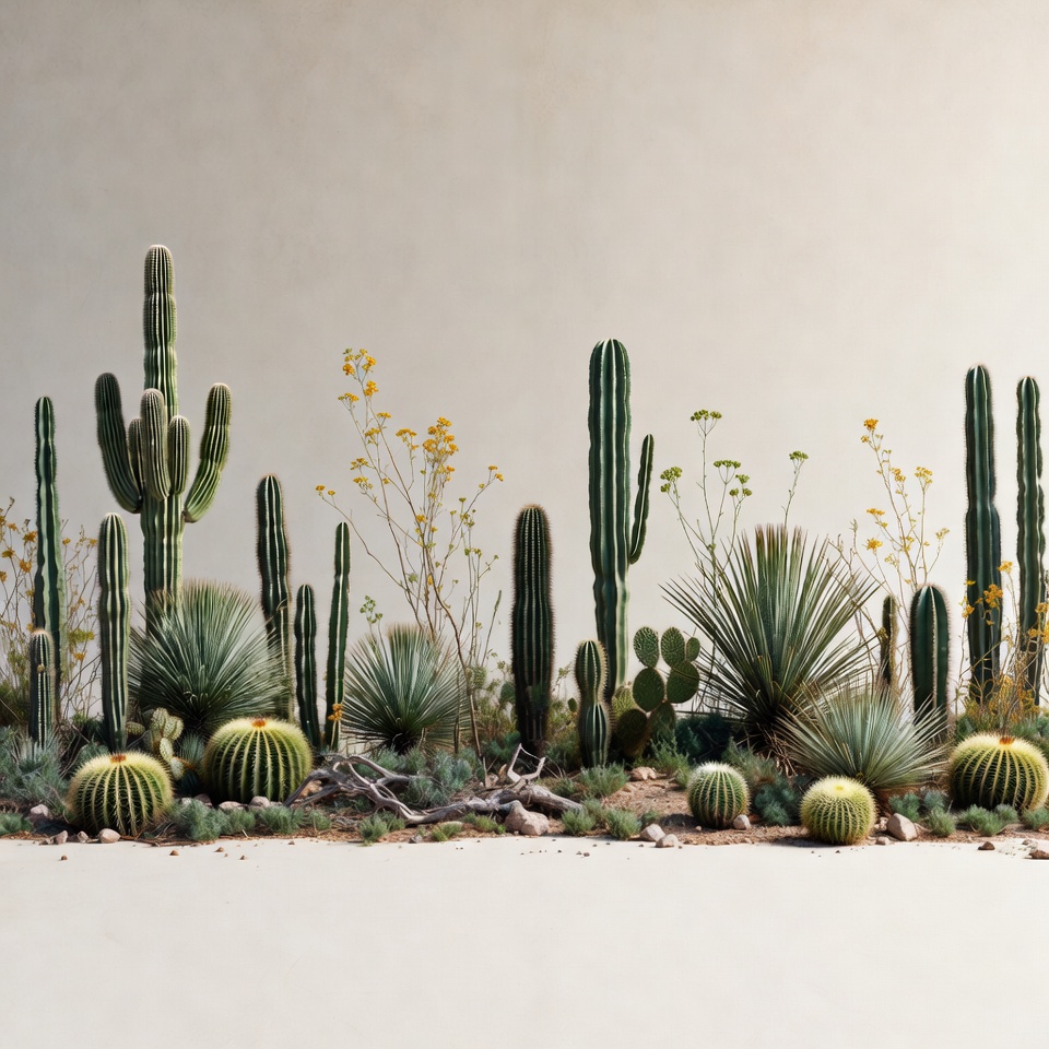 agave, barrel cactus, beige background, botanical display, desert flora, desert plants, drought tolerant, green plants, isolated background, light gray wall, natural composition, plant arrangement, potted plants, prickly pear, saguaro, sandy ground, spiky plants, succulents, xeriscape, yellow flowers, cactus