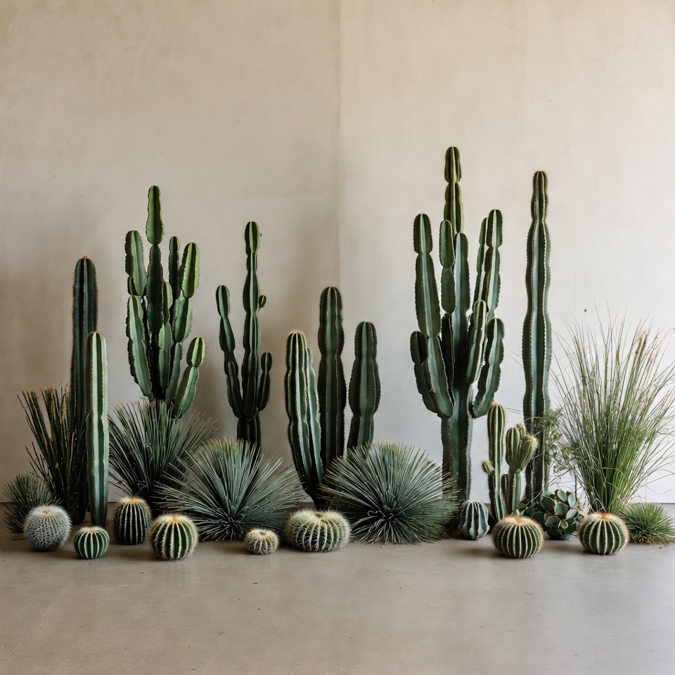 A variety of tall and short cacti plants, including columnar and spherical types, are arranged on a neutral beige floor against a matching wall. Green agave and grass plants add texture to the display. The composition features multiple saguaro-like cacti and clustered succulents in a minimalist setting.