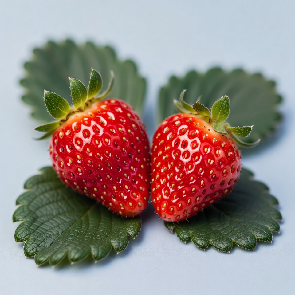 Two vibrant red strawberries sit side by side on fresh green leaves. The berries feature textured seeds and glossy surfaces against a plain light blue background. The leaves frame the strawberries neatly.