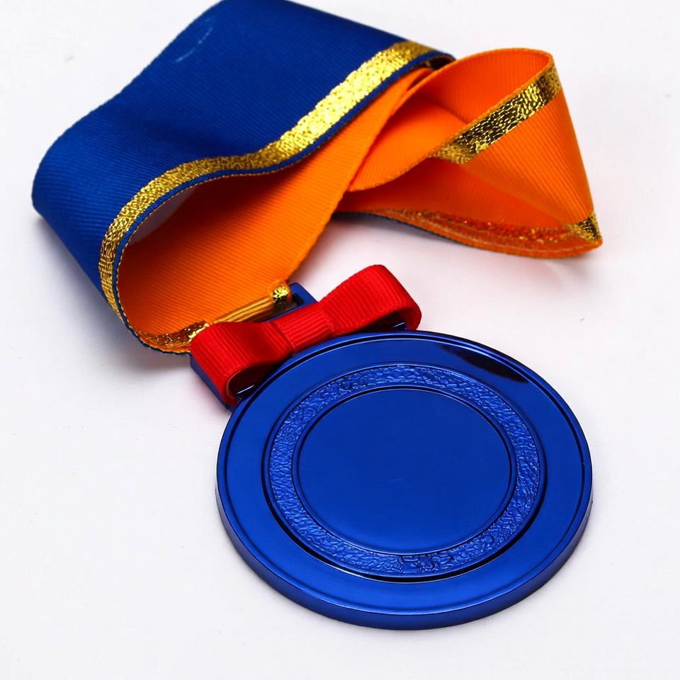 achievement, award, blue medal, blue ribbon, champion, circular medal, competition, gold trim, isolated background, orange ribbon, prize, red bow, ribbon, shiny medal, trophy, winner, medal